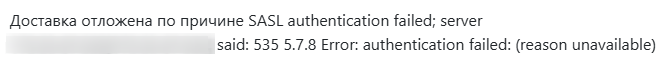 при отправке письма с почтового ящика ведущего сайта на почтовый ящик второго сайта в журнале событий появляется сообщение "Доставка отложена по причине SASL authentication failed; server <IP-адрес> said: 535 5.7.8 Error: authentication failed (reason unavailable)":
