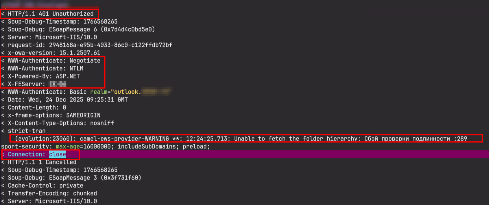 В полученном файле log.txt проверить, что после отправки Evolution анонимного запроса к серверу (без заголовка Authorization и без Cookie), сервер закрывает соединение:
