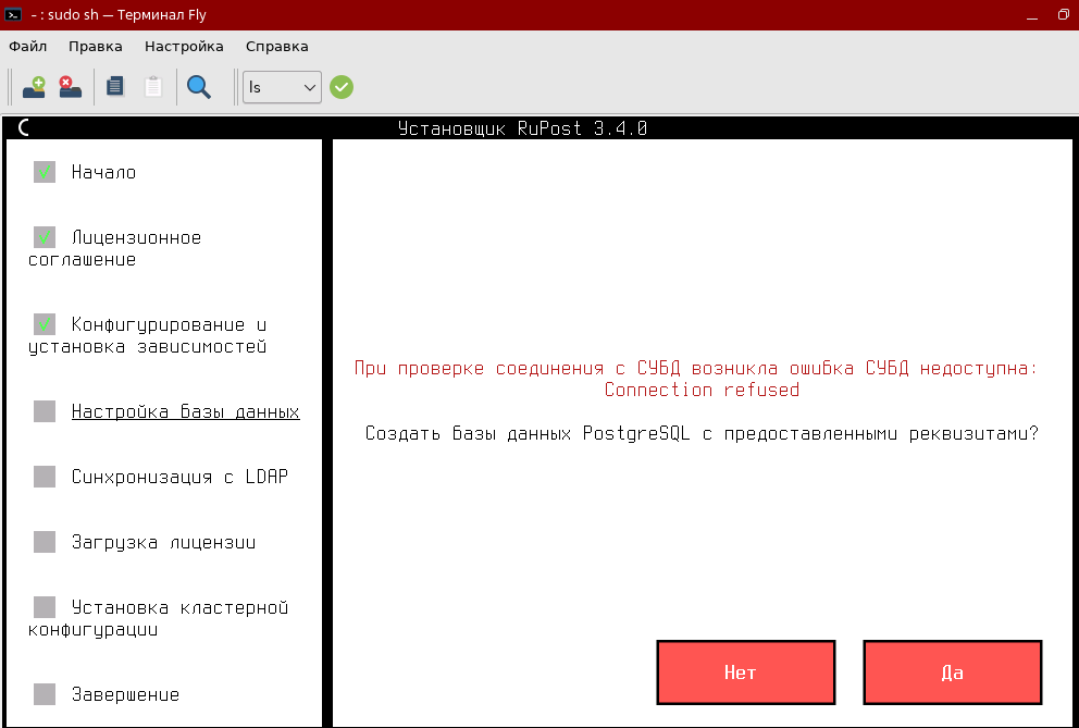 База знаний RuPost RuPost. Сервер не устанавливается Current: Не установлена СУБД PDF Download PDF Download page Не установлена СУБД. Current page All pages Не установлена СУБД Статья является возможным решением инцидента RuPost. Сервер не устанавливается ОкружениеRuPost 3.4.0 Диагностика При установке сервера RuPost на пункте "Настройка базы данных" происходит ошибка "Connection refused":Проверить, что СУБД не установлена: dpkg -l | grep postgresql CODE Решение Ответ доступен с подключенной услугой «Техническая поддержка». Ознакомиться с услугой Перейти к авторизации Внимание! Для авторизации используйте учетные данные Личного кабинета Если учетная запись от новой версии личного кабинета отсутствует, просим писать на почту lk@astralinux.ru При установке сервера RuPost на пункте "Настройка базы данных" происходит ошибка "Connection refused":Проверить, что СУБД не установлена: dpkg -l | grep postgresql CODE Возможная причина: Не установлена СУБД. Перейти к решению. ×