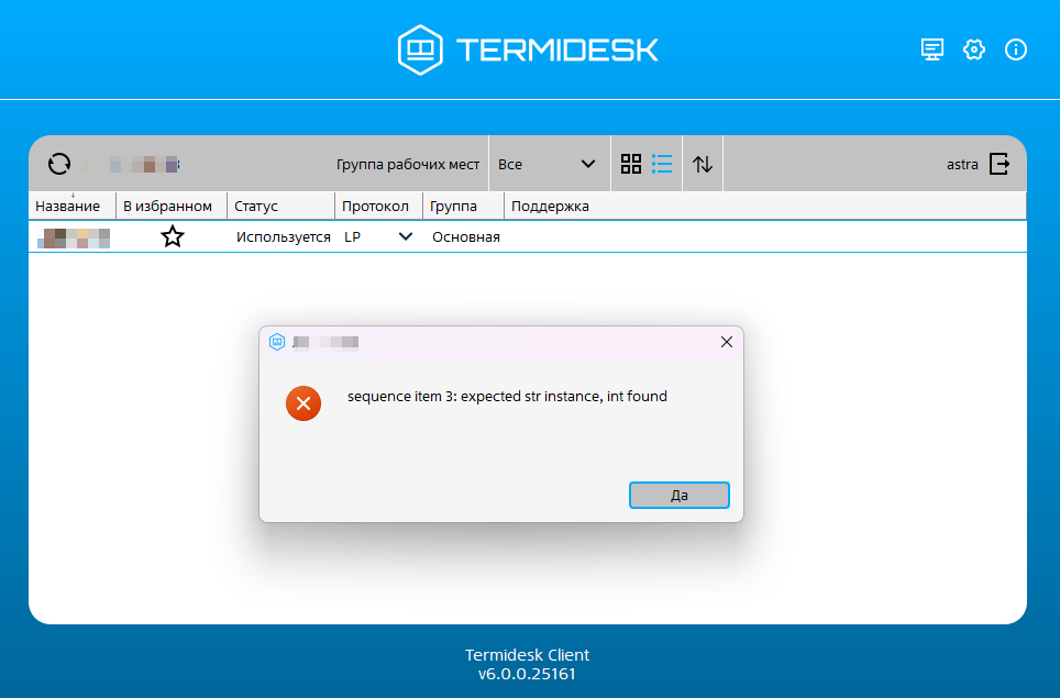 База знаний Termidesk Termidesk. Ошибка подключения по протоколу LoudPlay Current: Некорректный тип параметра experimental.loudplay.serverPort PDF Download PDF Download page Некорректный тип параметра experimental.loudplay.serverPort. Current page All pages Некорректный тип параметра experimental.loudplay.serverPort Статья является возможным решением инцидента Termidesk. Ошибка подключения по протоколу LoudPlay ОкружениеTermidesk 6.0 Astra Linux Special Edition 1.8Диагностика При попытке подключения появляется окно с ошибкой "sequence item 3: expected str instance, int found": Решение Ответ доступен с подключенной услугой «Техническая поддержка». Ознакомиться с услугой Перейти к авторизации Внимание! Для авторизации используйте учетные данные Личного кабинета Если учетная запись от новой версии личного кабинета отсутствует, просим писать на почту lk@astralinux.ru При попытке подключения появляется окно с ошибкой "sequence item 3: expected str instance, int found": Возможная причина: Некорректный тип параметра experimental.loudplay.serverPort. Перейти к решению. ×