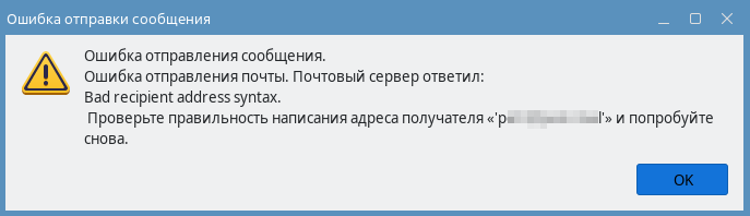 База знаний RuPost RuPost. Ошибка при отправке почты Current: Неправильный синтаксис адреса получателя PDF Download PDF Download page Неправильный синтаксис адреса получателя. Current page All pages Неправильный синтаксис адреса получателя Статья является возможным решением инцидента RuPost. Ошибка при отправке почты ОкружениеRuPost 3.4.1Диагностика При отправке из веб-клиента SOGo или клиентского приложения появляется ошибка "Bad recipient address syntax": Решение Ответ доступен с подключенной услугой «Техническая поддержка». Ознакомиться с услугой Перейти к авторизации Внимание! Для авторизации используйте учетные данные Личного кабинета Если учетная запись от новой версии личного кабинета отсутствует, просим писать на почту lk@astralinux.ru При отправке из веб-клиента SOGo или клиентского приложения появляется ошибка "Bad recipient address syntax": Возможная причина: Неправильный синтаксис адреса получателя. Перейти к решению. ×