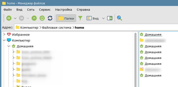 При работе нескольких пользователей, подключенных по xRDP, в файловом менеджере Fly-fm в каталоге /home/ домашние каталоги пользователей отображаются с одним именем — Домашняя. Пользователям проблематично определить свой домашний каталог.