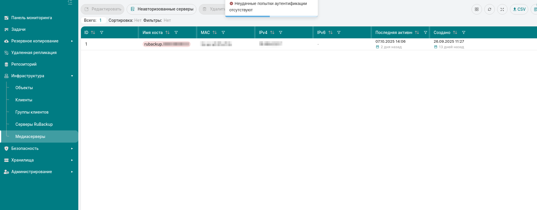 • В журнале сервера /opt/rubackup/log/RuBackup.log проверить наличие сообщения вида: