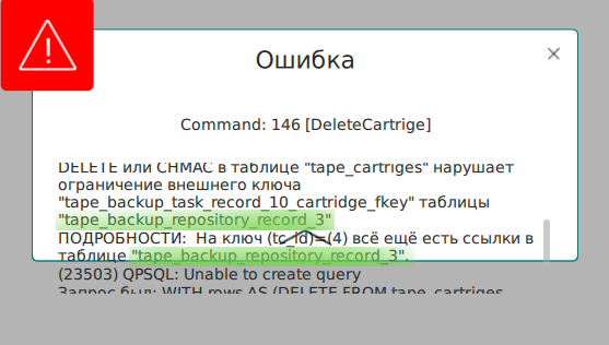 База знаний RuBackup RuBackup. Ошибка удаления картриджа ленточной библиотеки Current: RuBackup. Наличие резервных копий препятствует удалению картриджей PDF Download PDF Download page RuBackup. Наличие резервных копий препятствует удалению картриджей. Current page All pages RuBackup. Наличие резервных копий препятствует удалению картриджей Статья является возможным решением инцидента RuBackup. Ошибка удаления картриджа ленточной библиотеки ОкружениеRuBackup v2.5 Диагностика Текст ошибки содержит информацию о ее причине: Решение Ответ доступен с подключенной услугой «Техническая поддержка». Ознакомиться с услугой Перейти к авторизации Внимание! Для авторизации используйте учетные данные Личного кабинета Если учетная запись от новой версии личного кабинета отсутствует, просим писать на почту lk@astralinux.ru Текст ошибки содержит информацию о ее причине: Возможная причина: RuBackup. Наличие резервных копий препятствует удалению картриджей. Перейти к решению. ×
