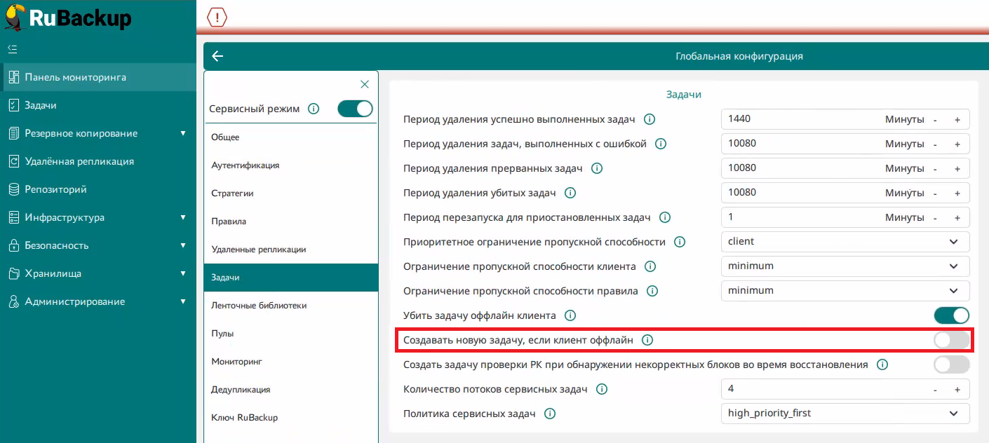 Проверить статус опции Создать новую задачу, если клиент оффлайн: