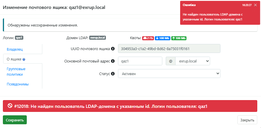 База знаний RuPost Current: RuPost. Не найден пользователь LDAP-домена с указанным id PDF Download PDF Download page RuPost. Не найден пользователь LDAP-домена с указанным id. Current page Include child pages All pages RuPost. Не найден пользователь LDAP-домена с указанным id ПроблемаПри изменении статуса, например на Активен, возникает ошибка вида "#12018: Не найден пользователь LDAP-домена с указанным id.":Диагностика Проверить, что LDAP-атрибут proxyAddresses не заполнен:Для MS AD: Get-ADUser <имя_пользователя> -properties * CODE Для FreeIPA / ALD Pro: ipa user-show <имя_пользователя> --all --raw CODE Возможная причина: Не задан атрибут proxyAddresses. Перейти к решению. Проверить, что в УЗ у LDAP-атрибута userAccountControl установлен флаг PASSWD_NOTREQD: ipa user-show <имя_пользователя> --all | grep userAccountControl CODE Пример вывода: userAccountControl: [544] NORMAL_ACCOUNT PASSWD_NOTREQD CODE Флаг свойстваЗначение в шестнадцатеричном разрядеЗначение в десятичном разрядеPASSWD_NOTREQD0x002032 Возможная причина: Установлен флаг PASSWD_NOTREQD. Перейти к решению. Возможные причины Не задан атрибут proxyAddresses Установлен флаг PASSWD_NOTREQD ×