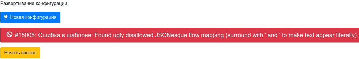Убедиться, что при развертывании конфигурации RuPost с шаблонами "Базовый шаблон конфигурации + Kaspersky/Dr. Web" появляется сообщение "Ошибка в шаблоне: Found ugly disallowed JSONesque flow mapping (surround with ' and ' to make text appear literally)":