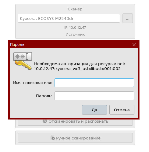 Со стороны клиента не требуется дополнительных настроек. При выполнении сканирования на устройстве с сервера saned будет выполнен запрос учетных данных для доступа к бэкенду устройства. Например: