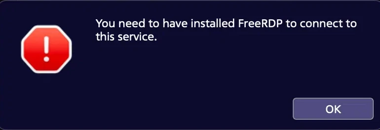 • Проверить при подключении с клиента macOS к ВРМ по протоколу RDP наличие ошибки "You need to have installed FreeRDP to connect to this service":