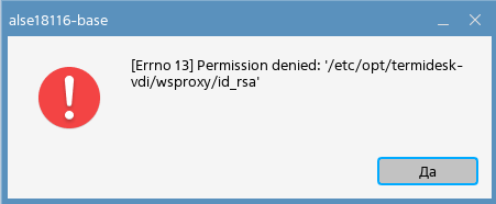 - Проверить, что при попытке подключения к фонду с использованием шлюза появляется ошибка "[Errno 13] Permission denided: '/etc/opt/termidesk-vdi/wsproxy/id_rsa'":