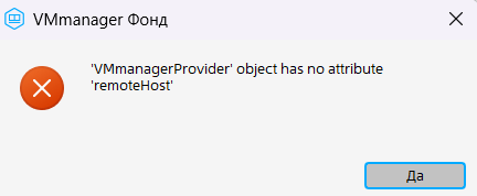 - Проверить при подключении к фонду виртуальных рабочих мест (ВРМ) по протоколу RDP наличие сообщения вида: ""VMmanagerProvider' object has no attribute 'remoteHost'":