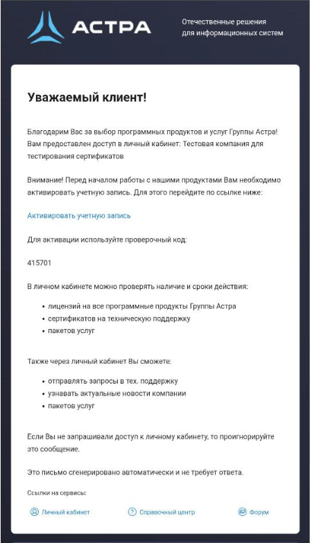 Код активации направляется в письме на почту клиента, указанную при оформлении заказа после совершения оплаты заказа, или пользователя, приглашенного в ЛК Администратором.