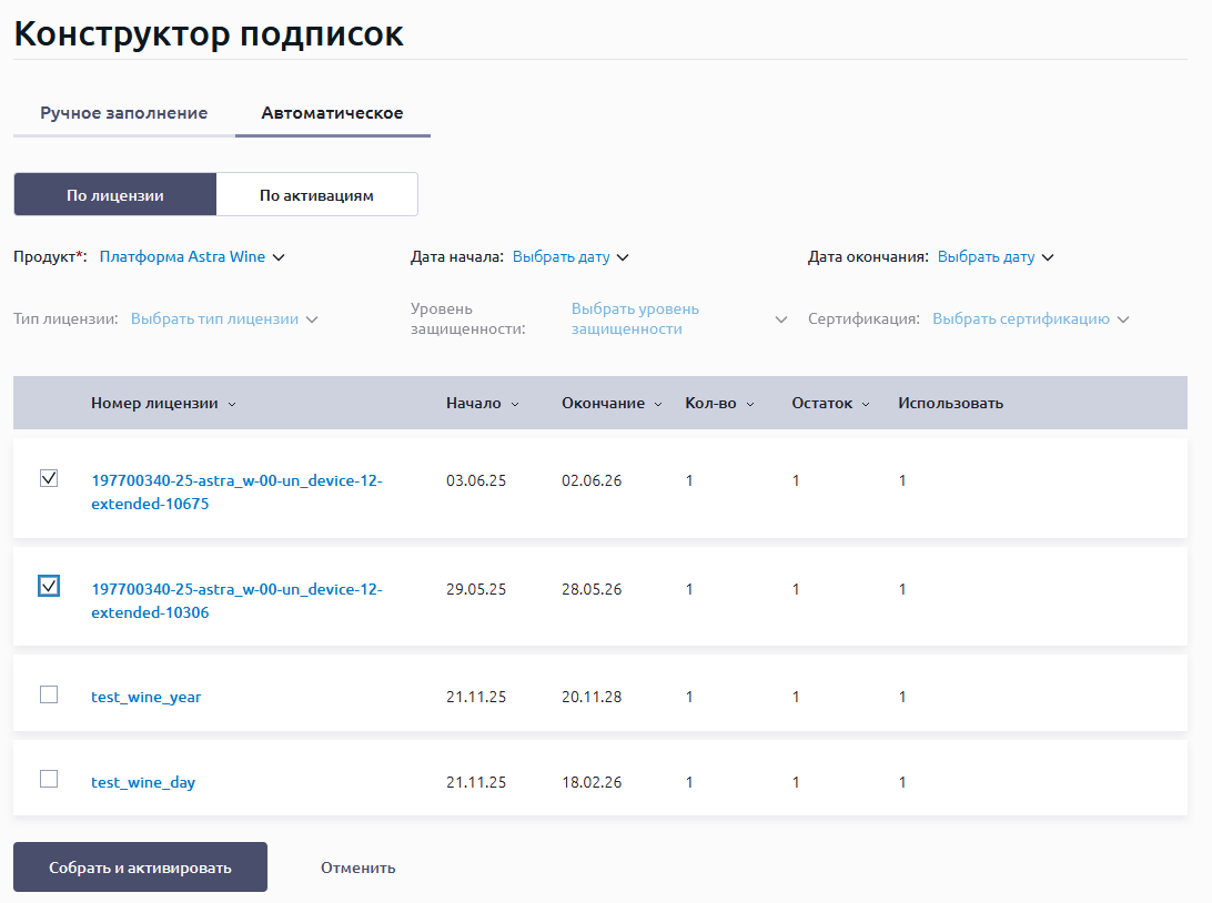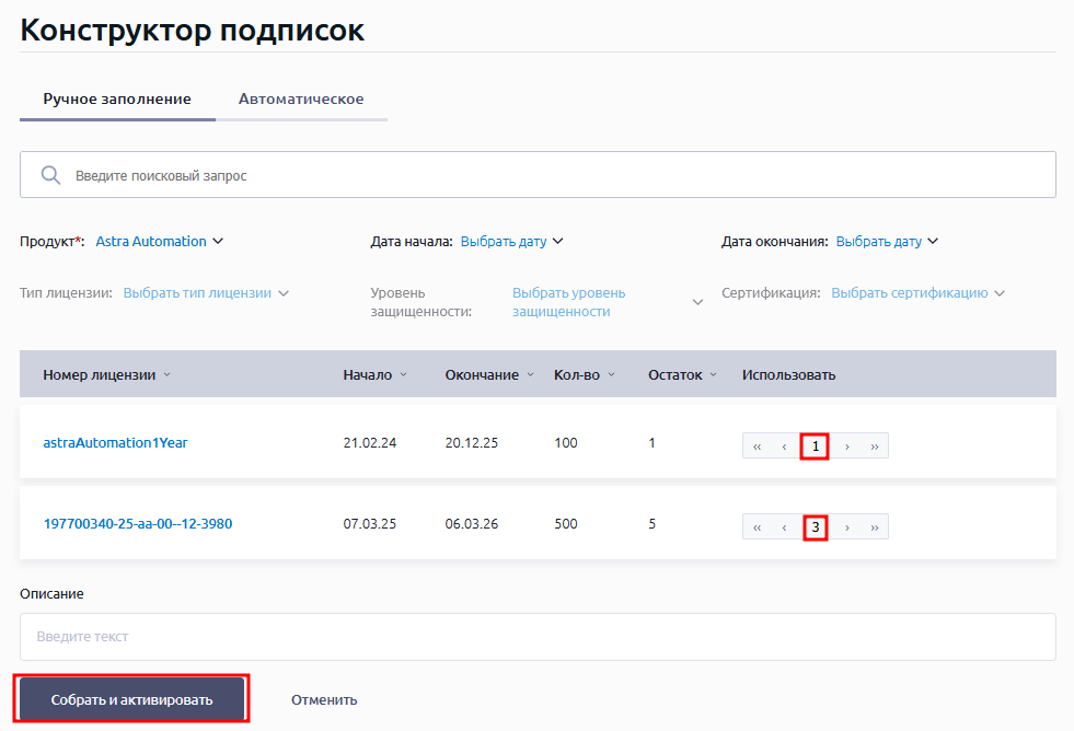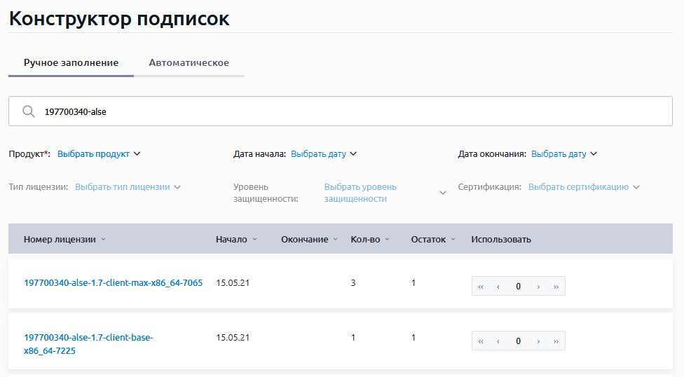- Ручное заполнение — режим ручного выбора пользователем списка Лицензий и количества по ним для добавления в подписку. Каждая подписка создается отдельно;