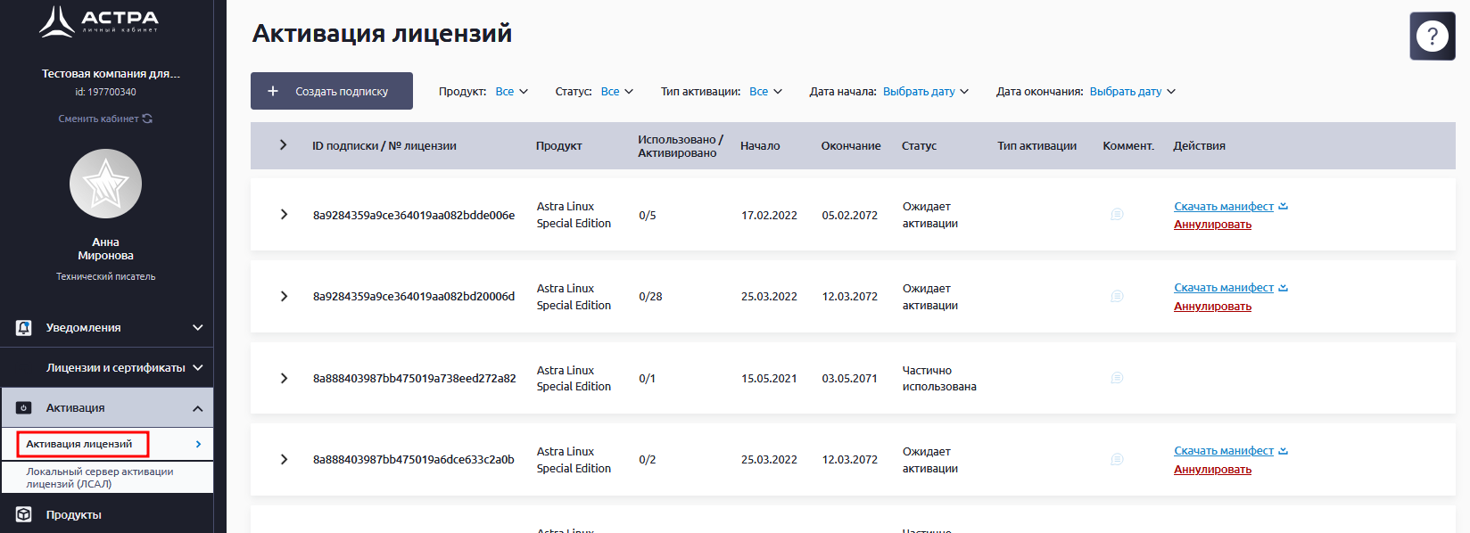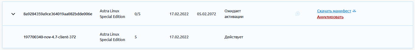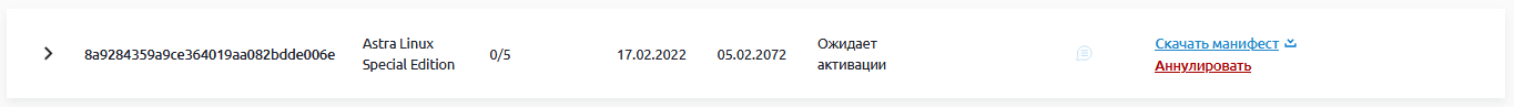 - Скачать манифест — для проведения оффлайн активации Лицензии (например, для Продуктов, разворачивающихся в закрытом контуре заказчика);