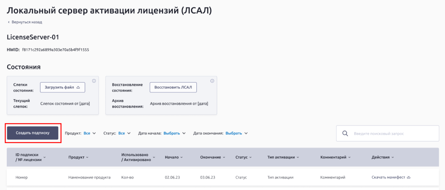 - Нажать кнопку Создать подписку для добавления подписки на продукт и активации: