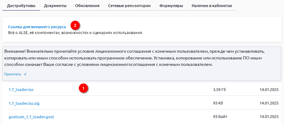 Во вкладке Дистрибутивы размещен основной установочный образ продукта и ссылка (при наличии) на дополнительную информацию по продукту: