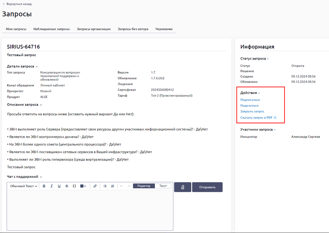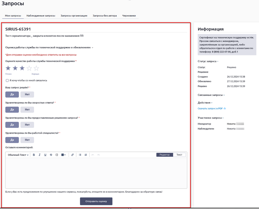- Закрыть запрос — перевести запрос в завершающий статус со стороны клиента. Работы по такому запросу со стороны поддержки завершаются.