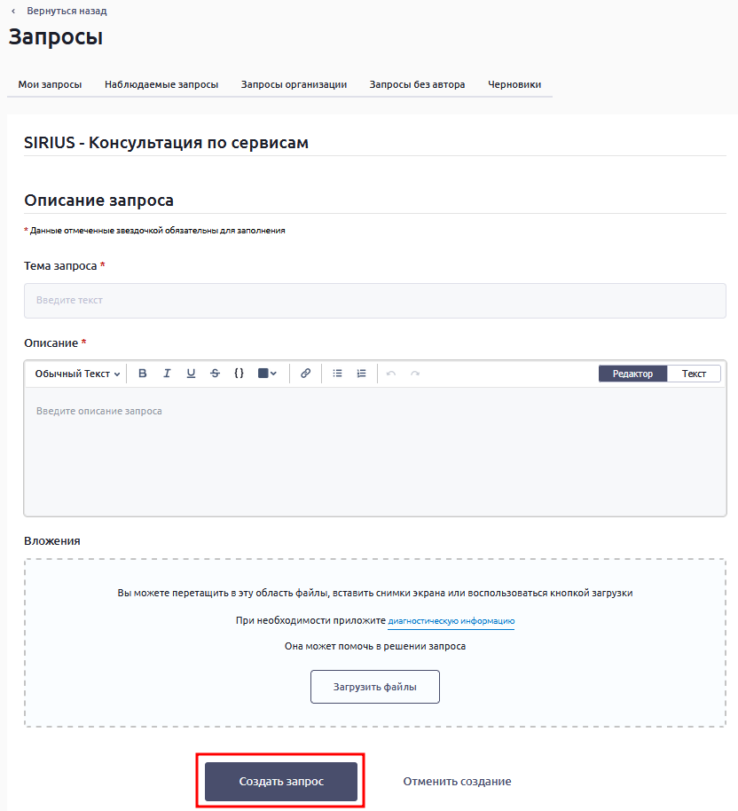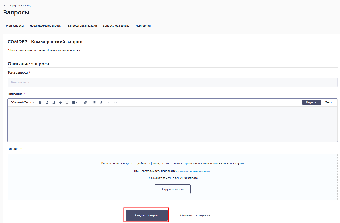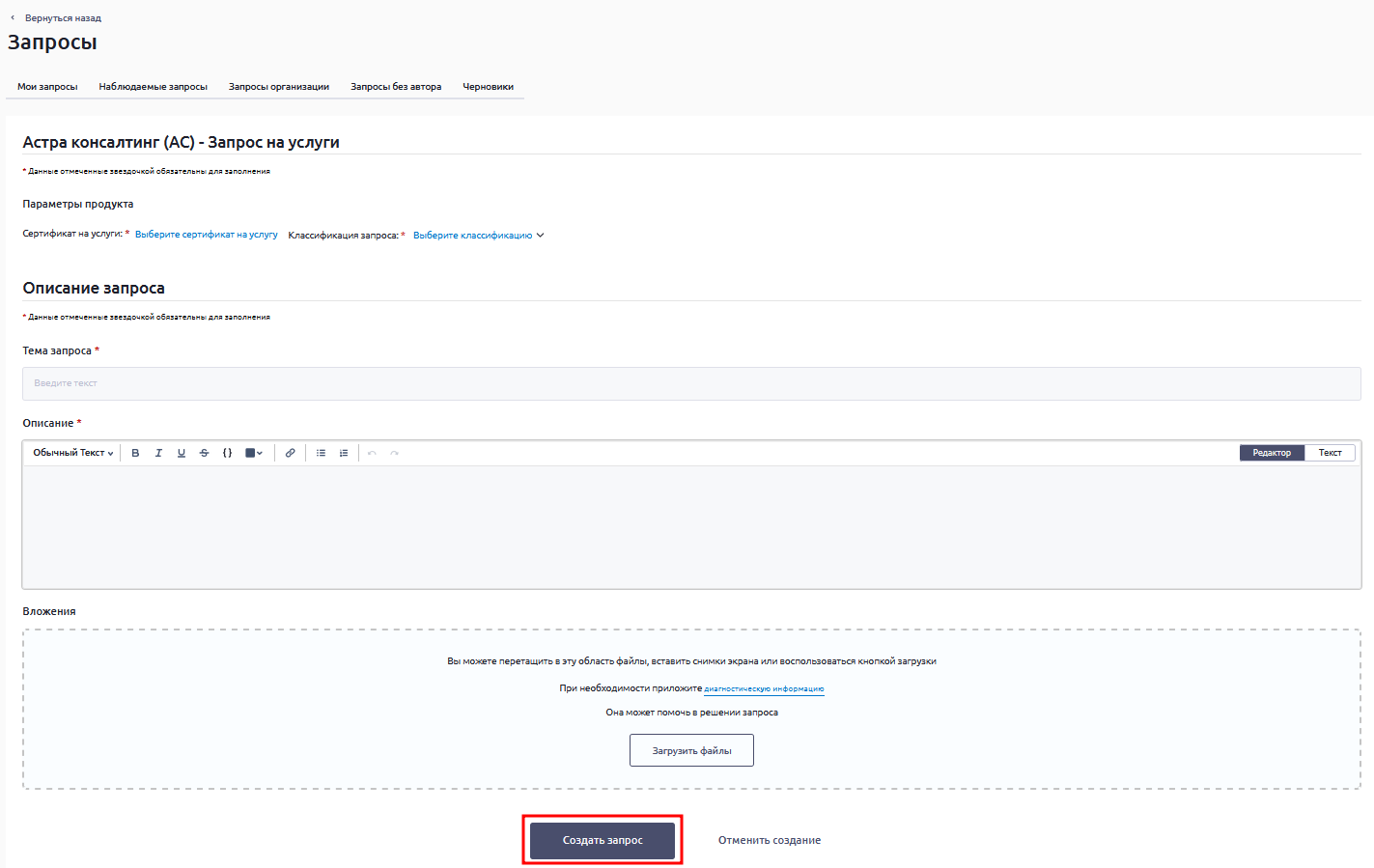 Внизу страницы доступа вкладка Вложения, в которой можно загрузить файлы, относящиеся к запросу. Для завершения формирования запроса следует нажать кнопку Создать запрос: