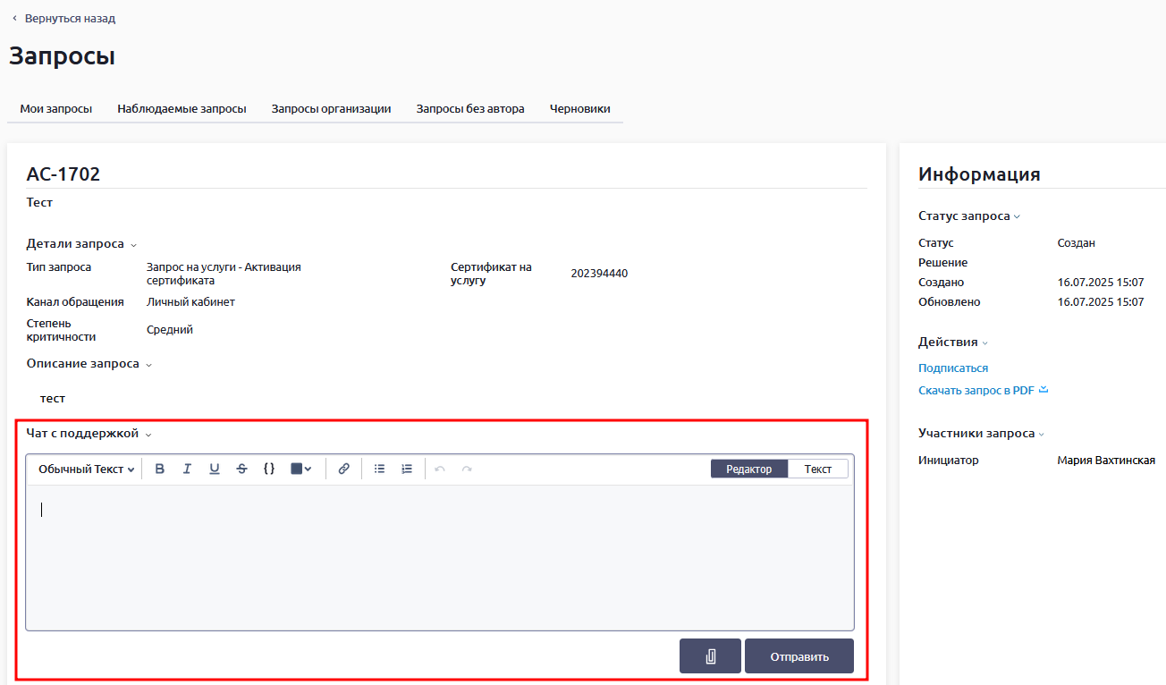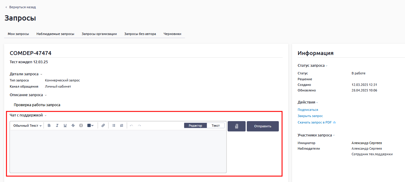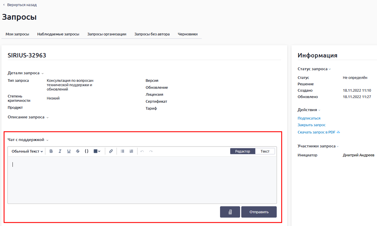Во вкладке Мои запросы при нажатии на созданный запрос откроется чат с поддержкой по данному запросу, в который можно прикрепить файлы-вложения, относящиеся к запросу, а также вести переписку по данному запросу с ответственным сотрудником: