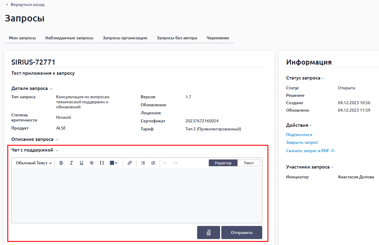 При нажатии на созданный запрос откроется чат с поддержкой по данному запросу, в который можно прикрепить файлы-вложения, относящиеся к запросу, а также вести переписку по данному запросу с сотрудниками технической поддержки: