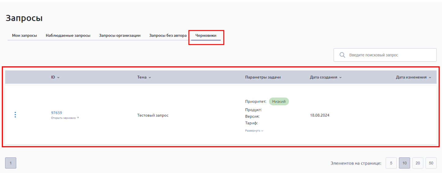 При возникновении технического сбоя во время формирования запроса, он будет сохранен во вкладке Черновики. Ччтобы продолжить работу с черновиком, необходимо выбрать его в списке и продолжить заполнение формы запроса. |