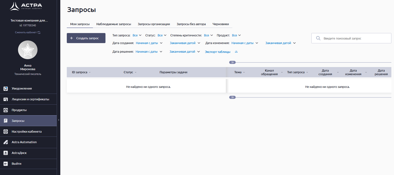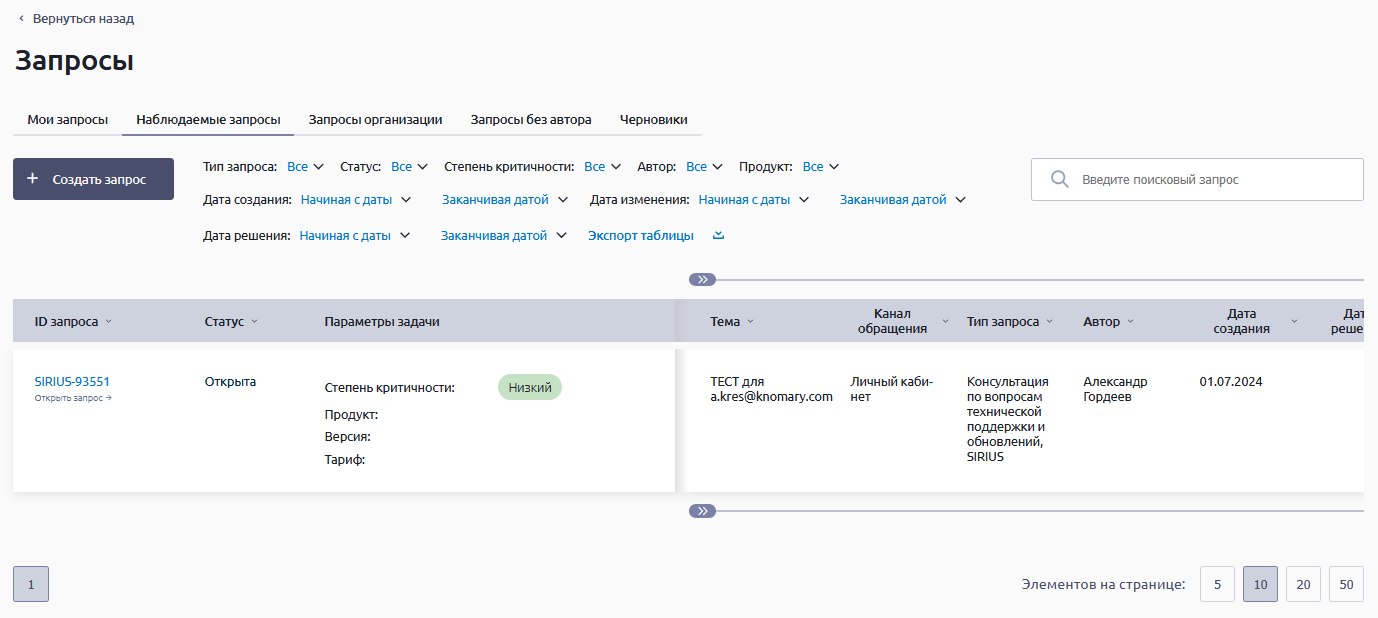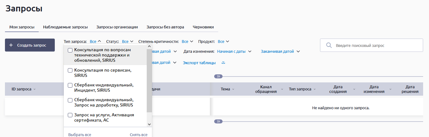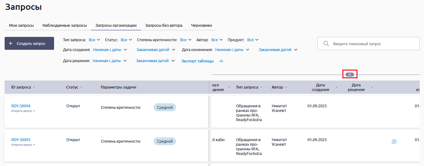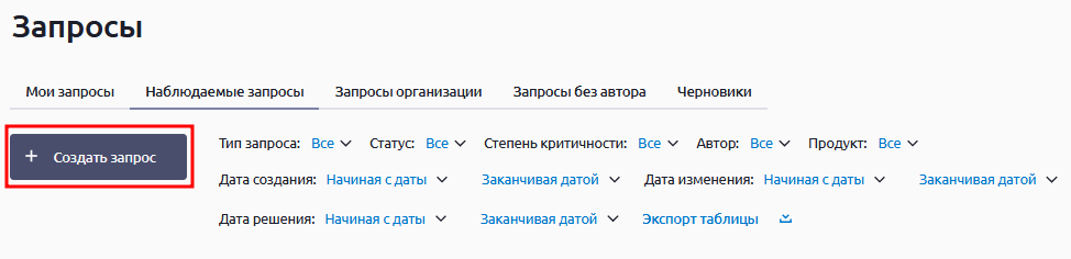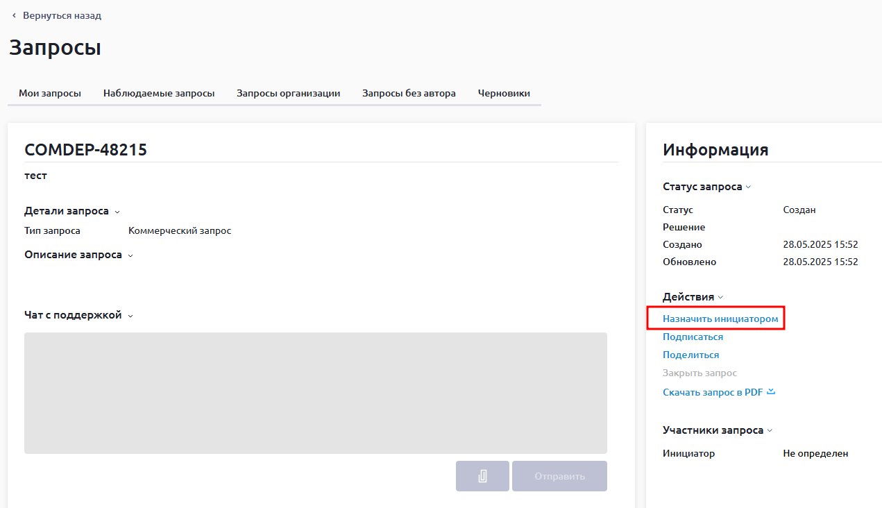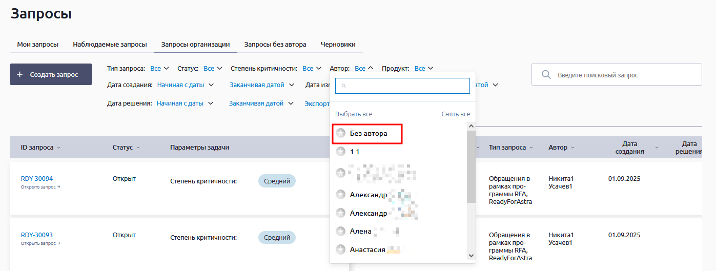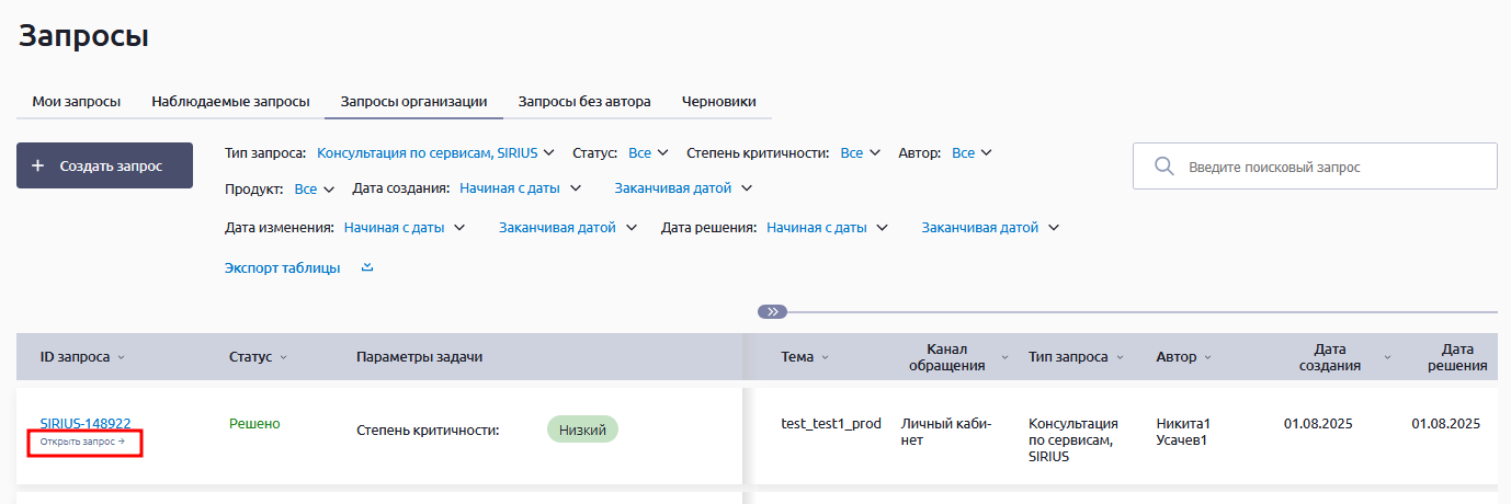 Также запросы без инициатора отображаются во вкладке Запросы организации вместе с другими запросами: