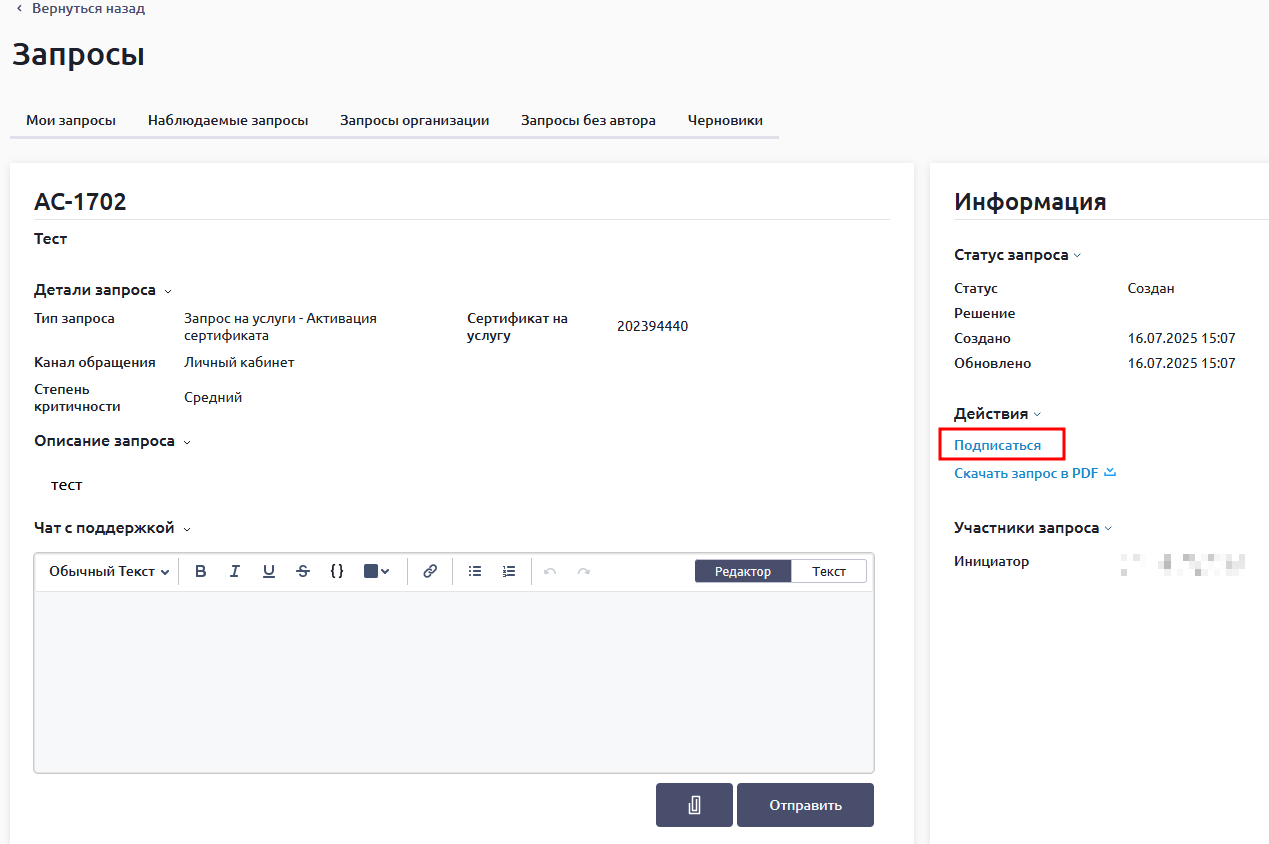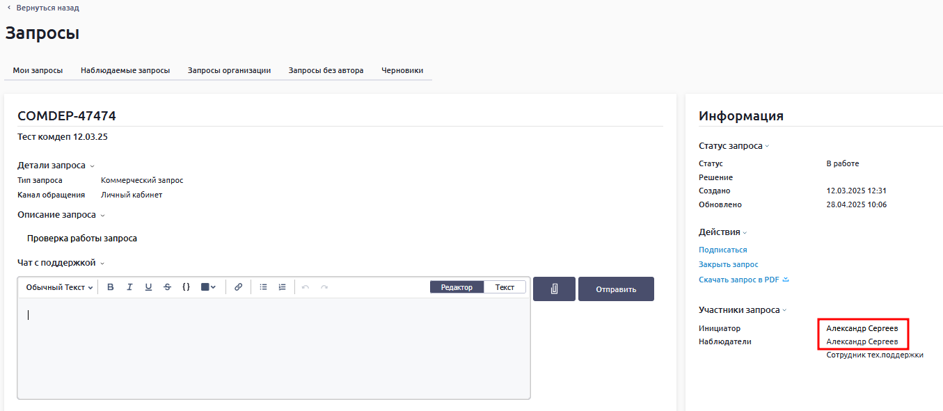 Инициатор автоматически становится наблюдателем и будет получать обновления по данному запросу: