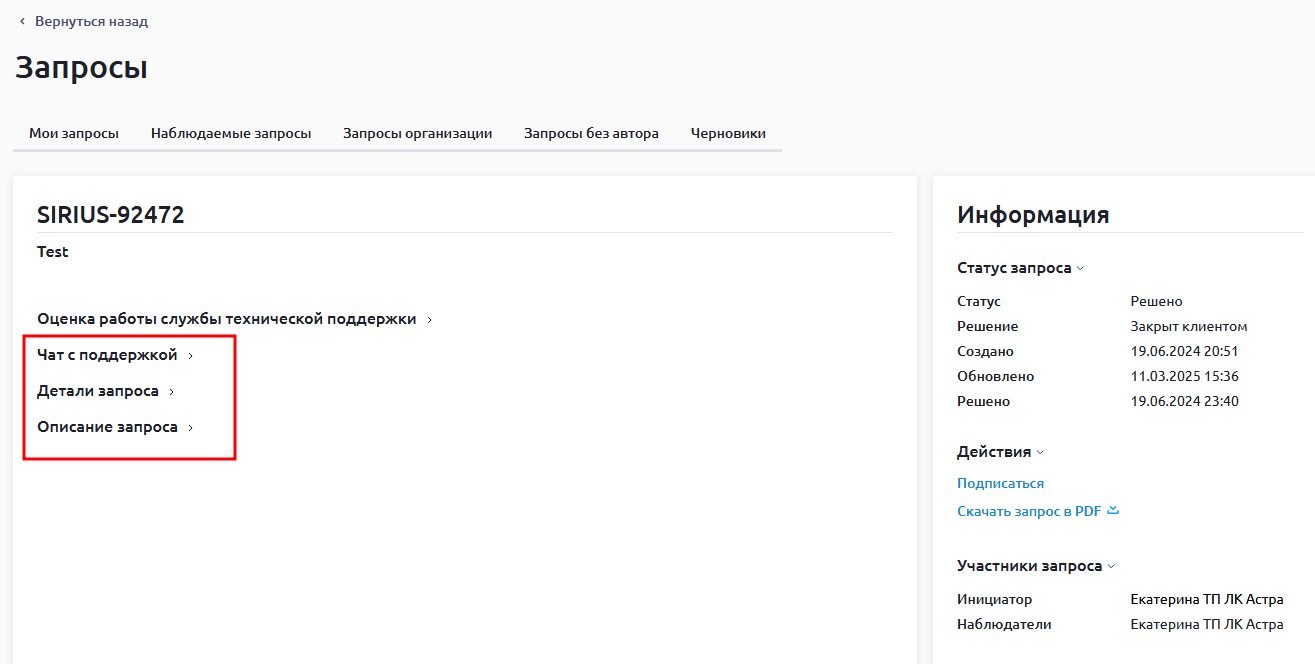 После закрытия запроса вся информация (Детали запроса, Описание запроса и Чат с поддержкой) остается доступной: