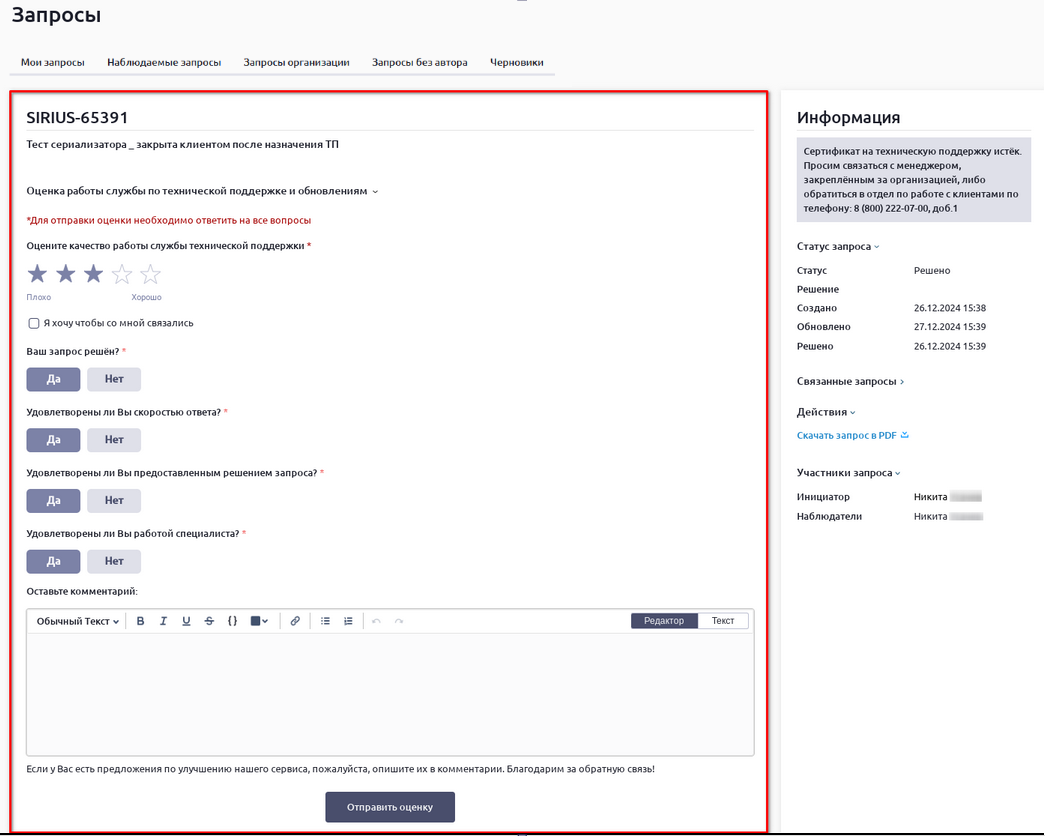 - ввести дополнительную информацию, которая относится к закрытому запросу (например, инициатору необходимо передать новые записи в техническую поддержку для дальнейшего изучения проблемы):