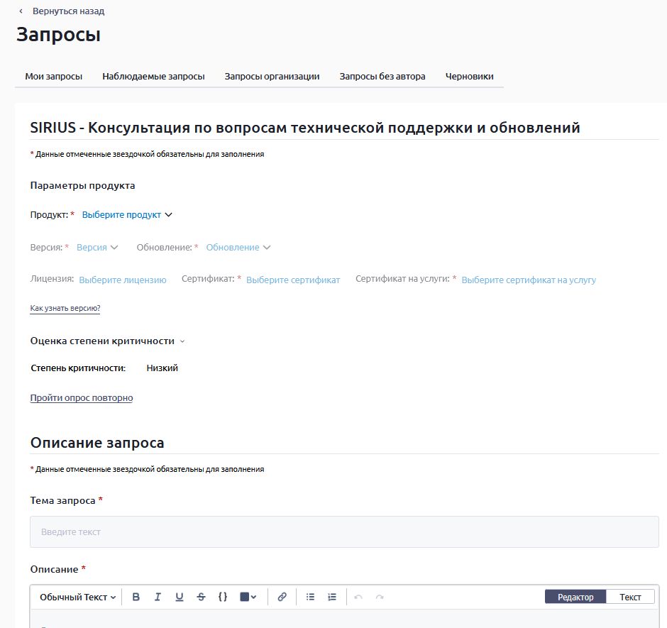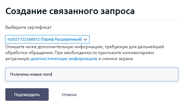Создание связанного запроса доступно пользователям с действующими сертификатами на техническую поддержку. |