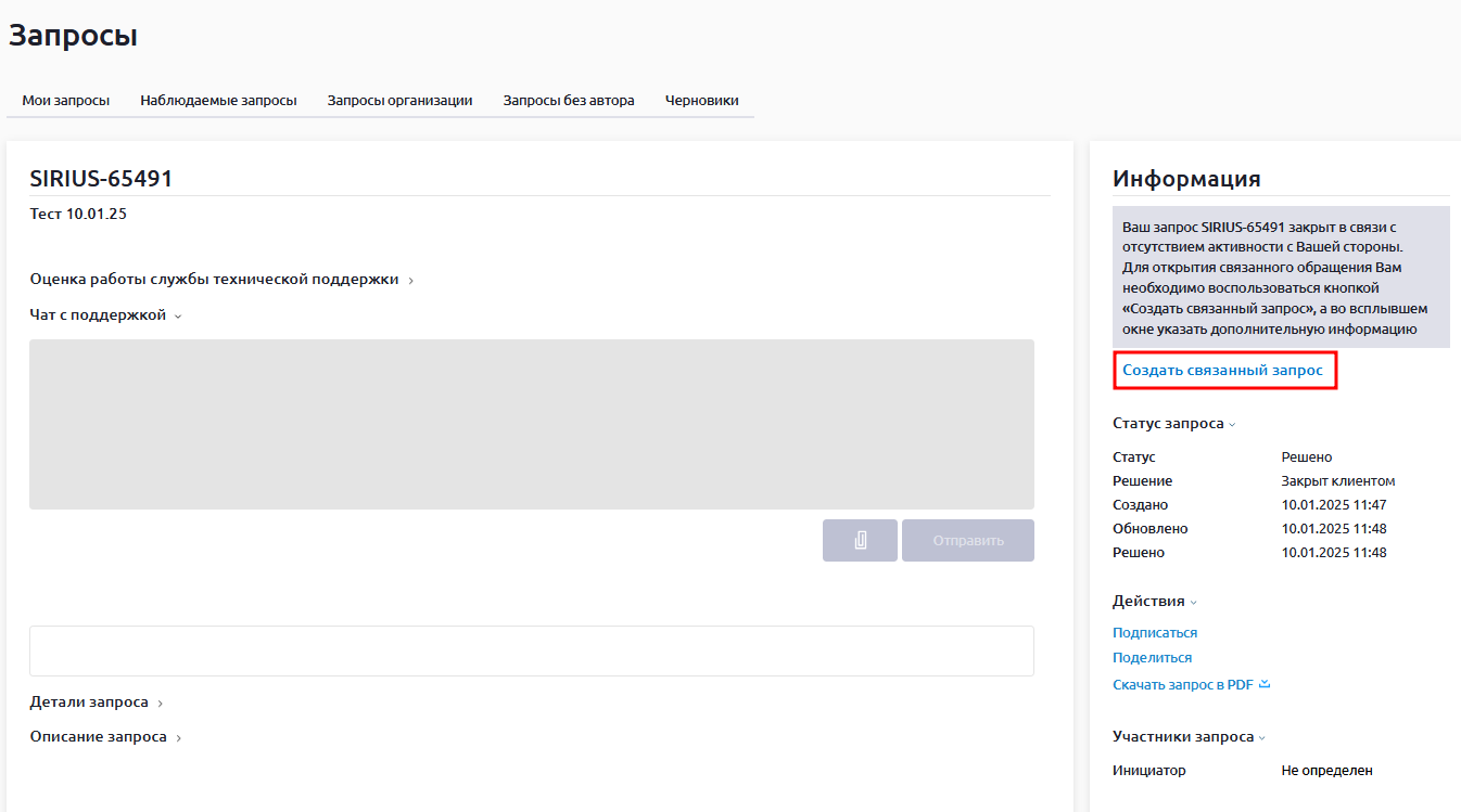 - по истечении 72 часов — запрос закрывается окончательно в связи с отсутствием активности со стороны инициатора. Но появляется возможность создать связанный запрос.