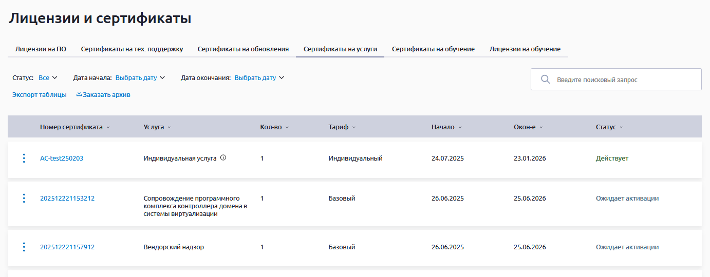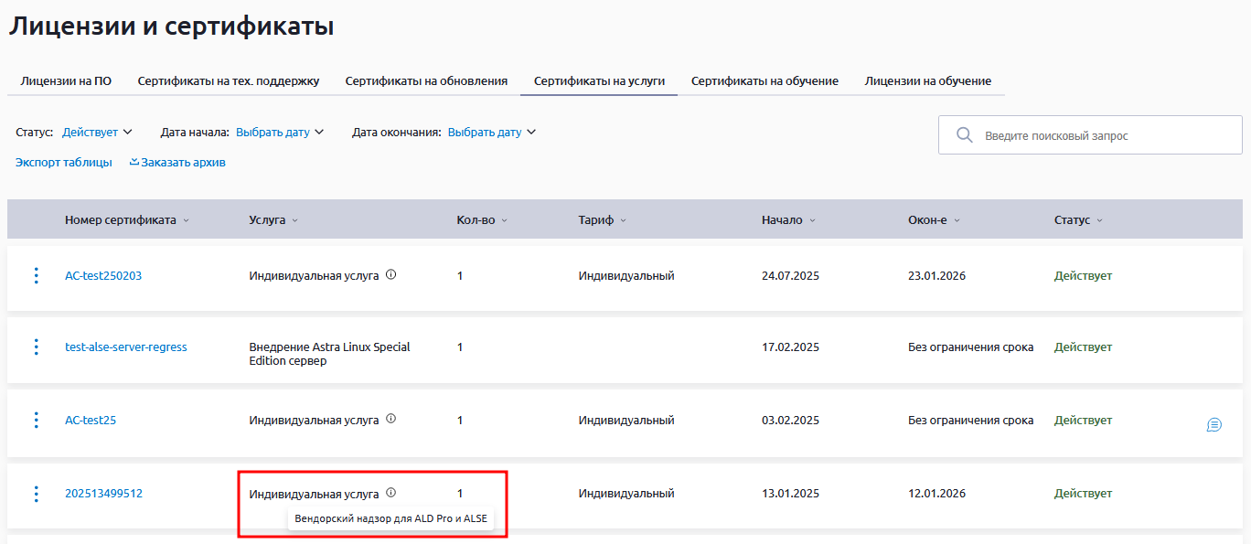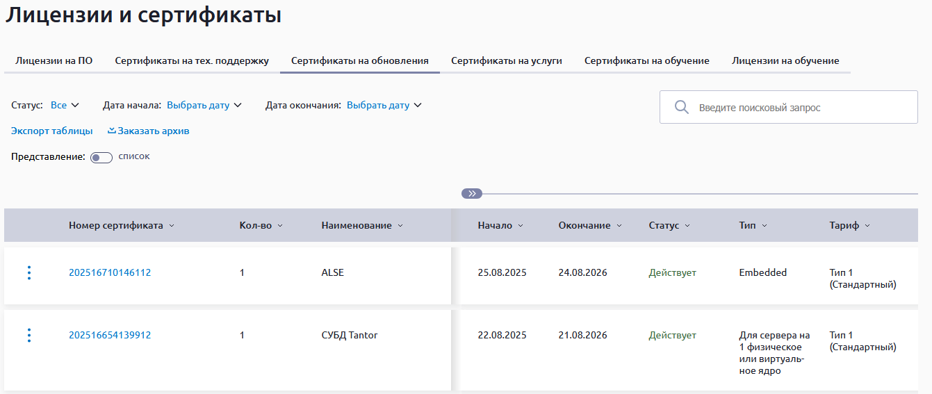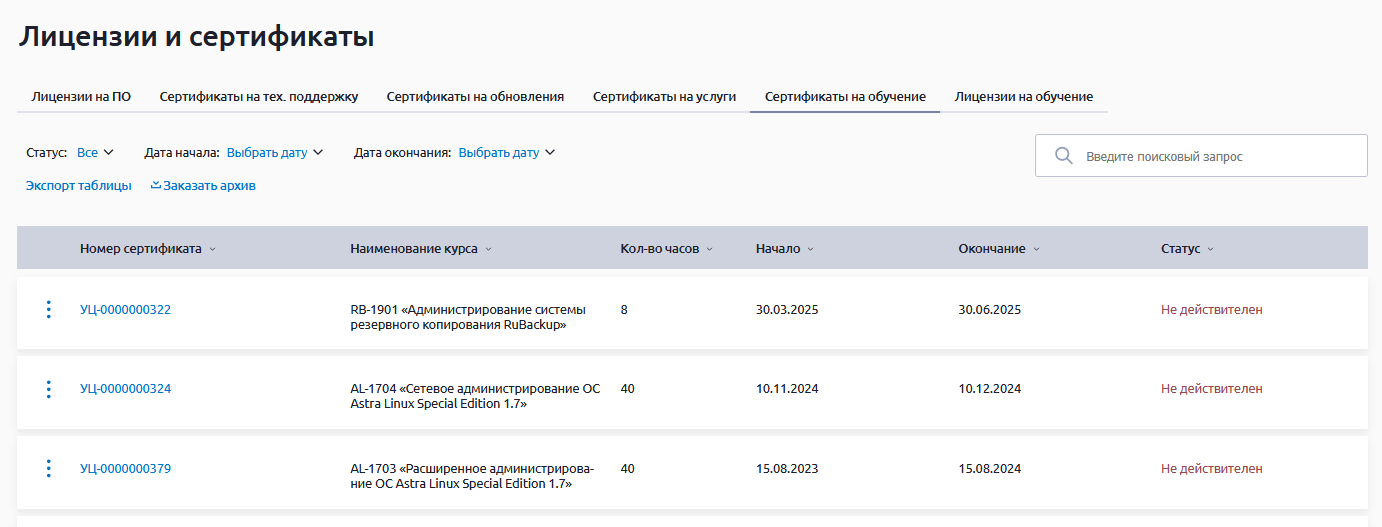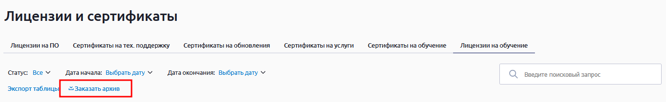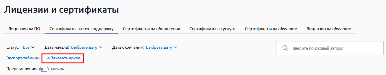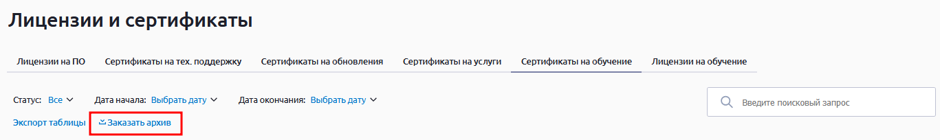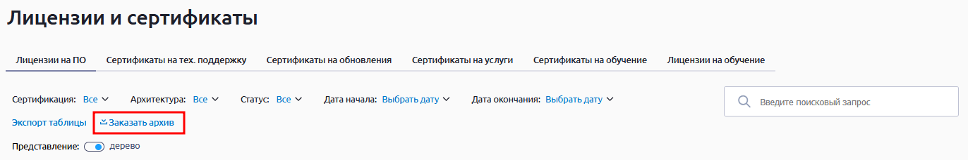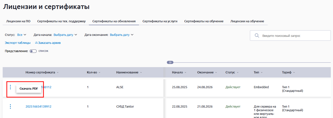 Указанный Указанная ниже функционал функциональность по экспорту таблицы, заказу архива и скачиванию PDF-файлов доступен доступна для всех элементов раздела Лицензии и сертификаты. |