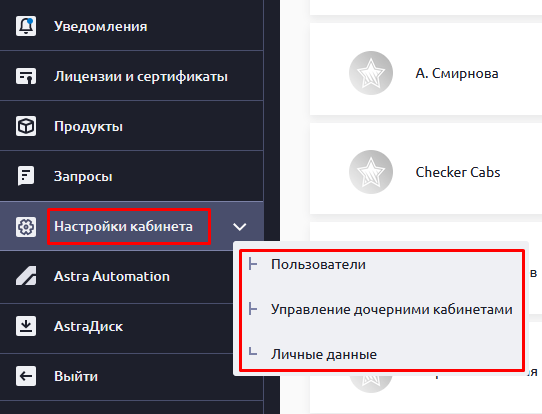 Из раздела доступен переход в подразделы Пользователи, Управление дочерними кабинетами и Личные данные: