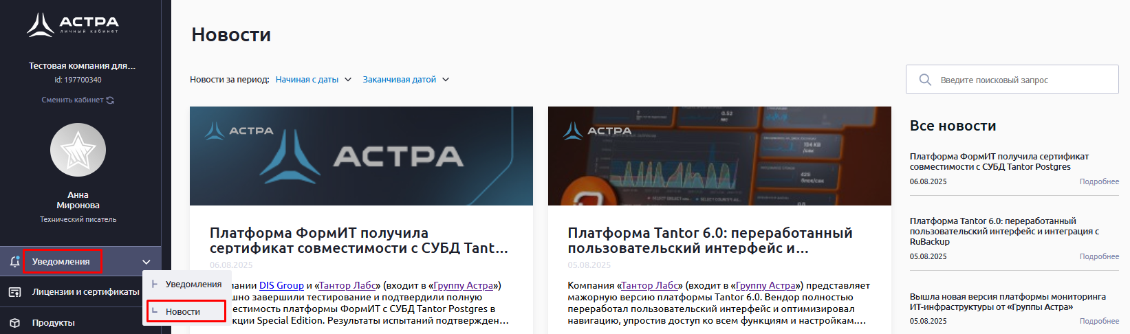 Из раздела Уведомления доступен переход к новостям Группы Астра, а также уведомлениям и их настройкам.