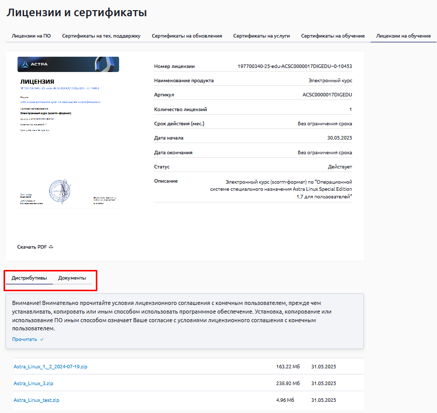 Для скачивания лицензии в данном разделе также доступна кнопка Скачать PDF внизу описания.