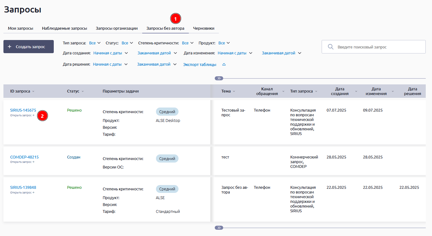 - Открыть вкладку Запросы без автора (1) и нажать Открыть запрос (2):