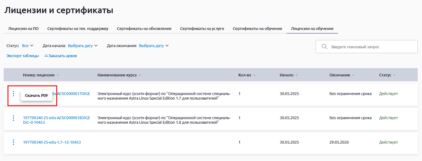 При нажатии на троеточие у каждой лицензии доступна кнопка для скачивания PDF данной лицензии: