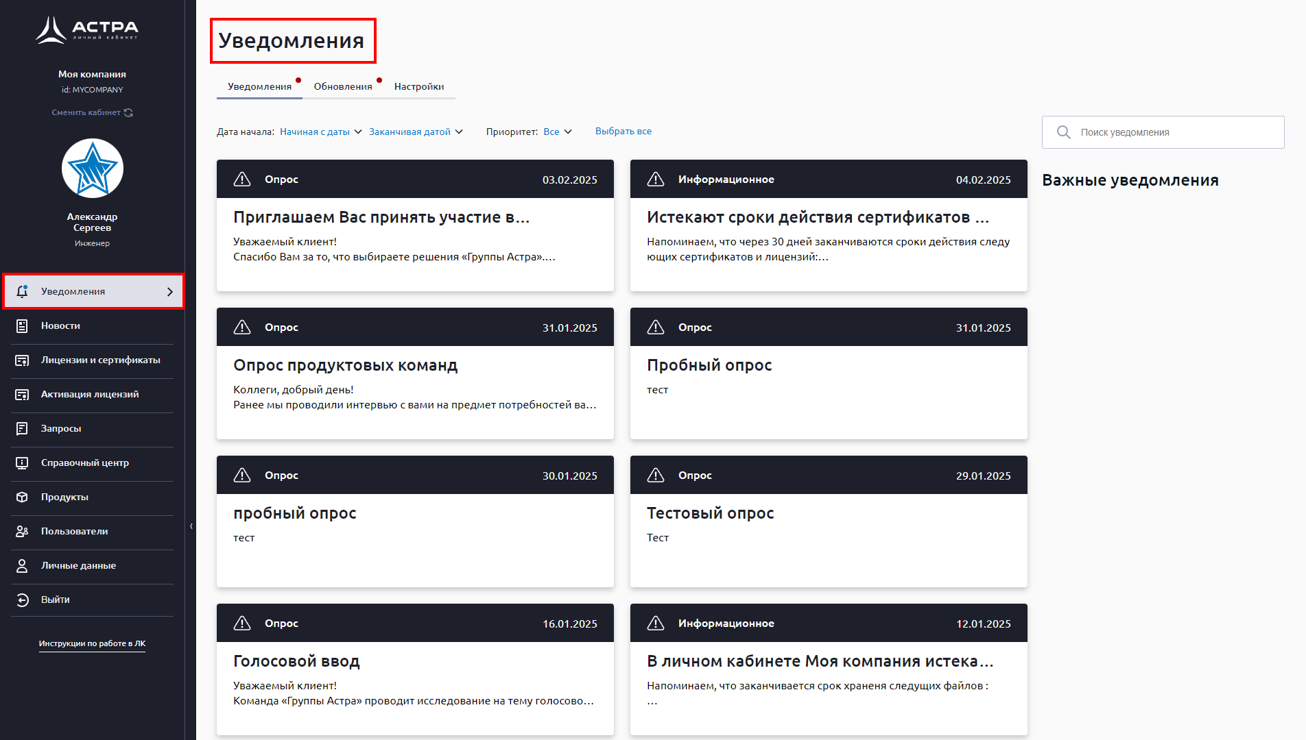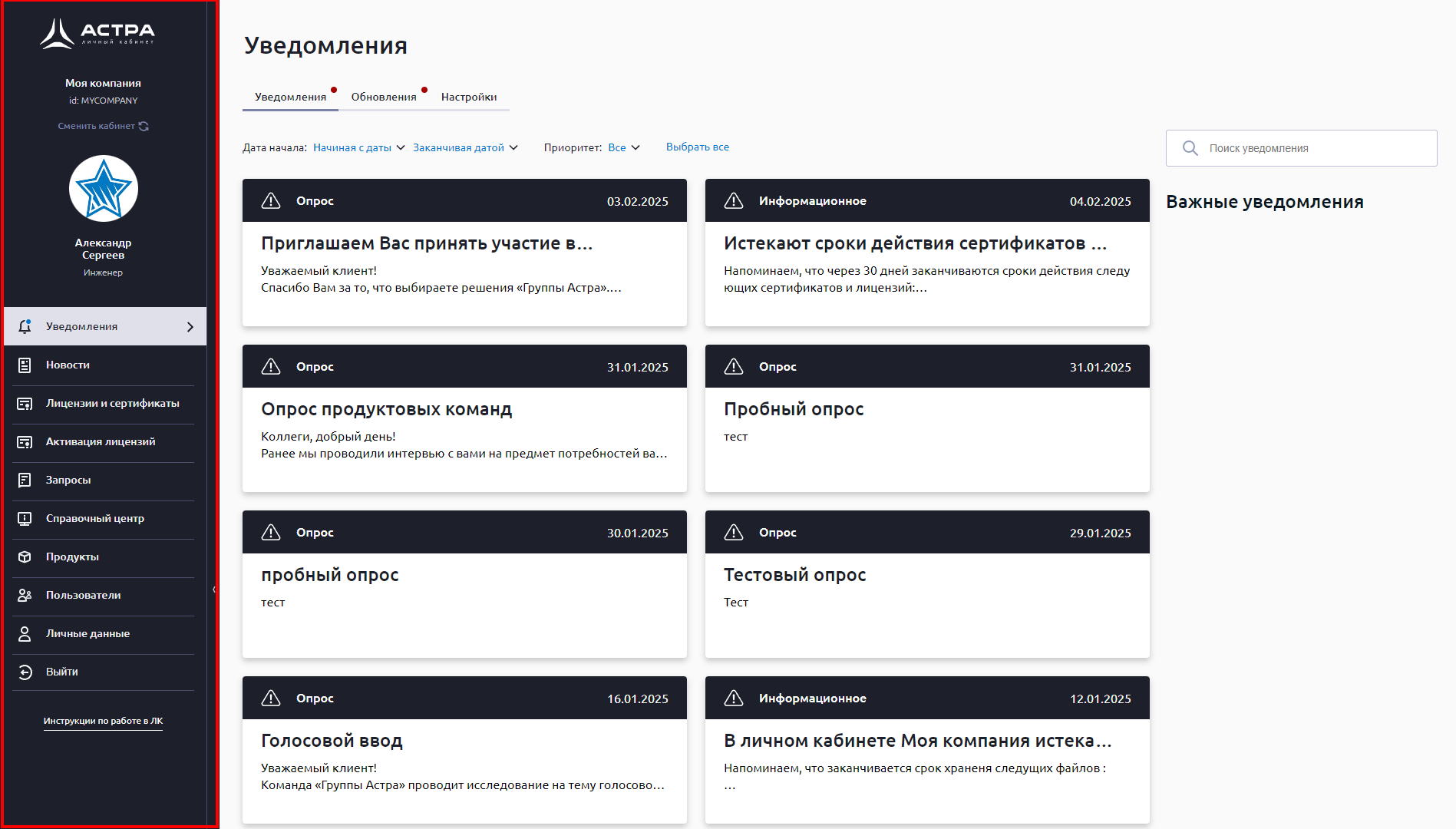 В разделе Уведомления отображаются оповещения, связанные с лицензиями, сертификатами и сменой пароля пользователя.