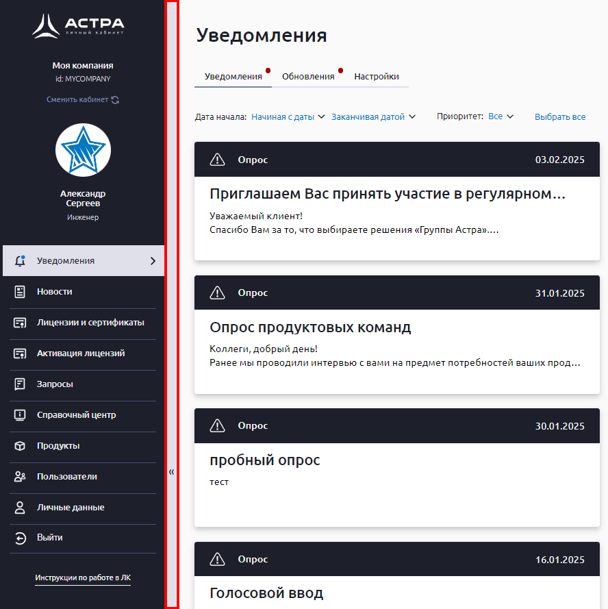 Для перехода в необходимый раздел при работе в Личном кабинете используется боковое меню слева: Пользователь ЛК может находиться в нескольких кабинетах с использованием одной учетной записи. Чтобы переключиться на работу в другом кабинете, необходимо нажать Сменить кабинет в боковом меню под именем пользователя: Затем выбрать во всплывающем окне необходимый кабинет из списка: Пользователь, состоящий в нескольких кабинетах, видит всю доступную информацию (уведомления, лицензи, запросы и т.д.) только того кабинета, в котором он находится в данный момент. Данные с нескольких кабинетов не объединяются! Чтобы получить доступ к информации другого кабинета, необходимо сменить кабинет, как указано выше. Боковое меню можно уменьшить, нажав на стрелку: В таком случае боковое меню сдвигается влево и приобретает вид: