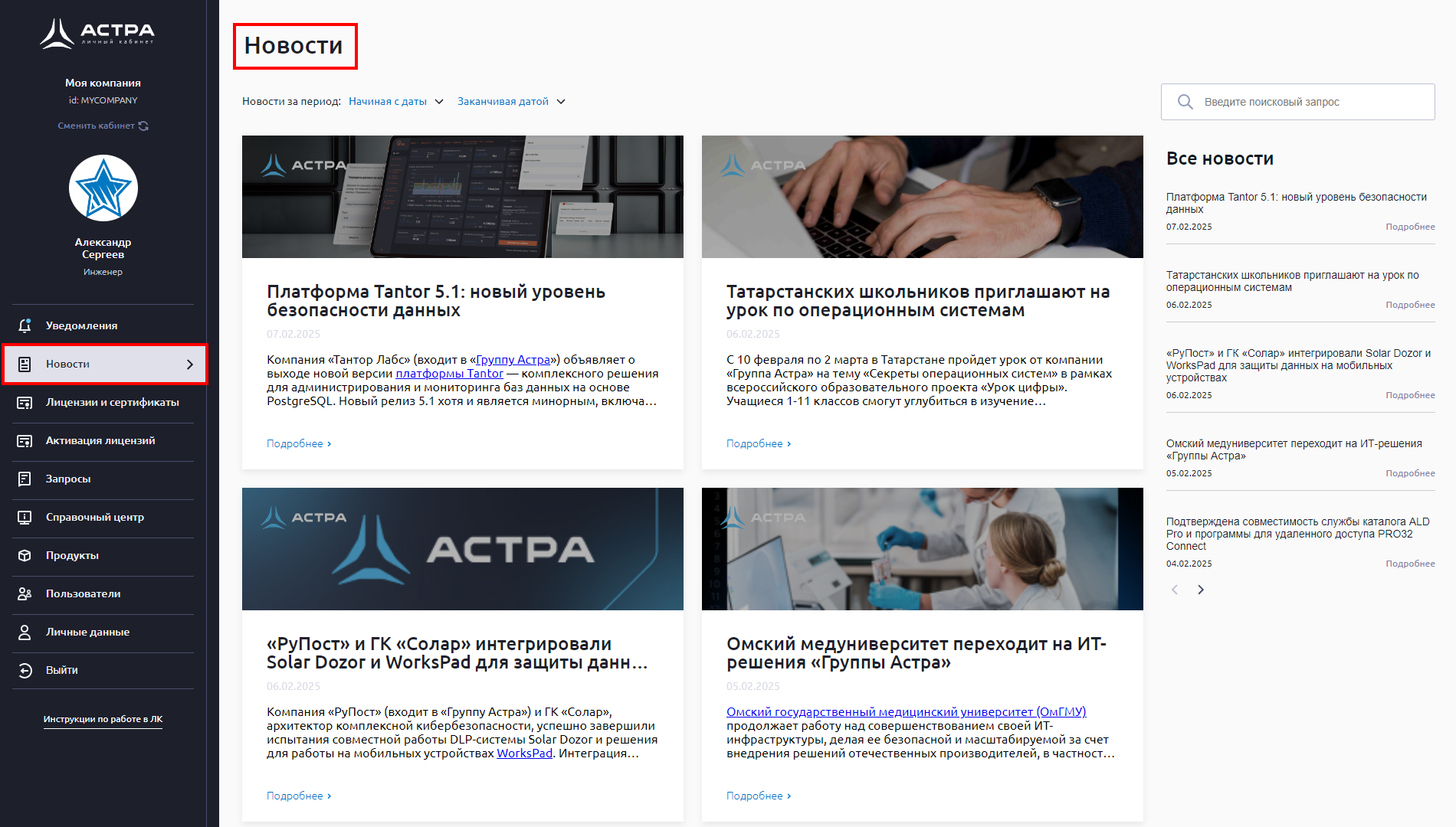 В разделе Продукты отображена лента продуктов Группы Астра, на которые приобретена лицензия в данном кабинете, с названиями и логотипами: