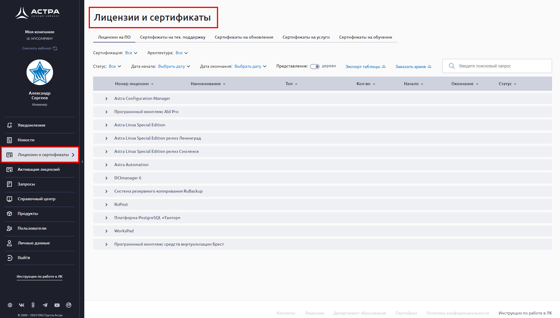 Указанный ниже функционал по экспорту таблицы, заказу архива и скачиванию PDF-файлов доступен для всех элементов раздела Лицензии и сертификаты.