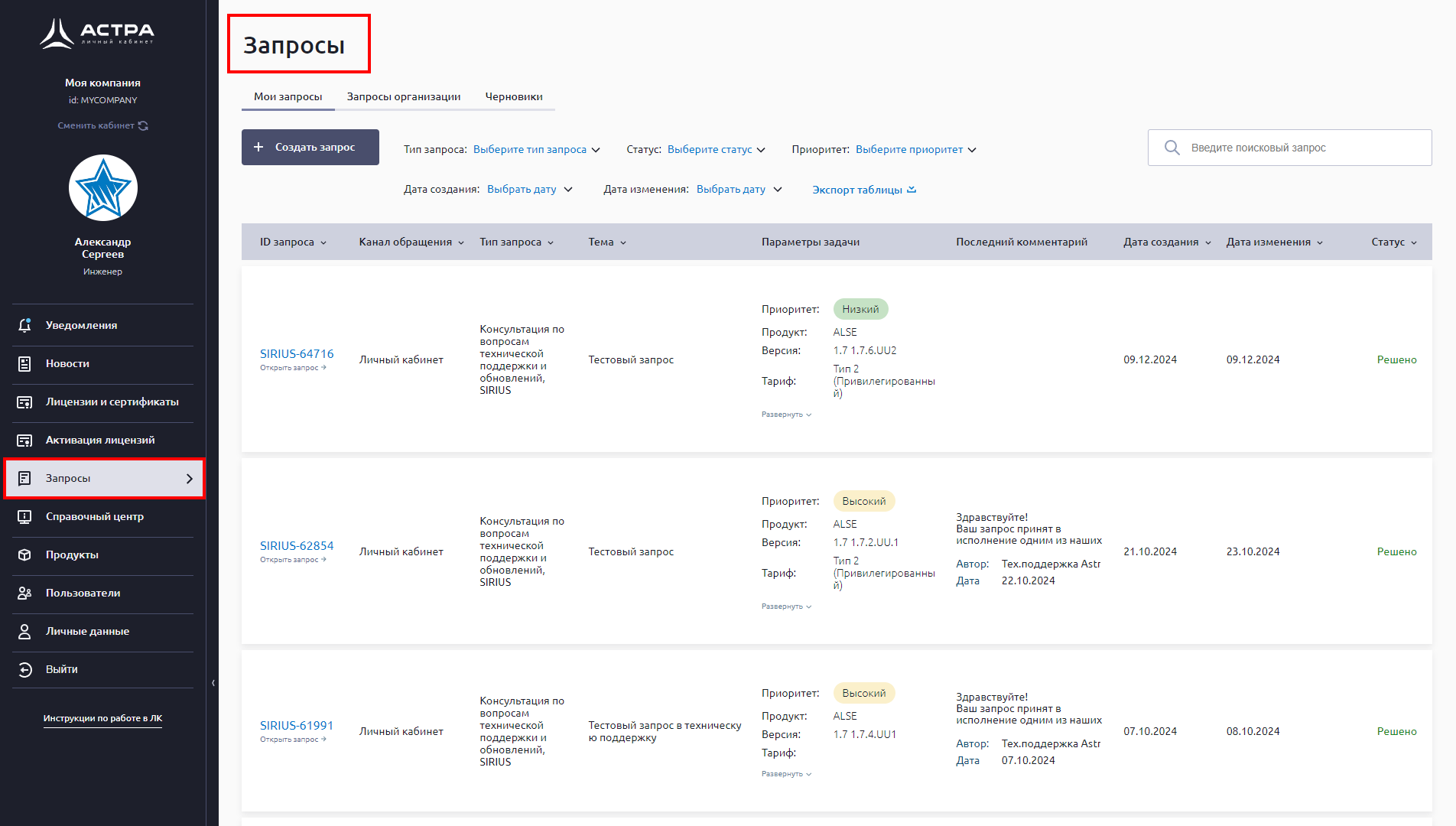 В разделе Запросы можно создать запрос и просмотреть список созданных обращений в техподдержку (ТП).