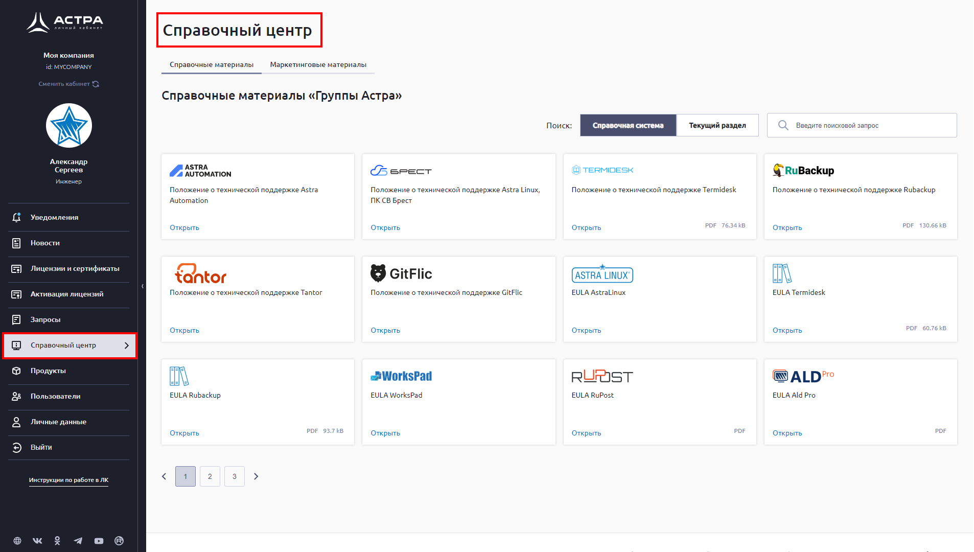 В разделе Справочный центр можно просматривать справочные и маркетинговые материалы Группы Астра: