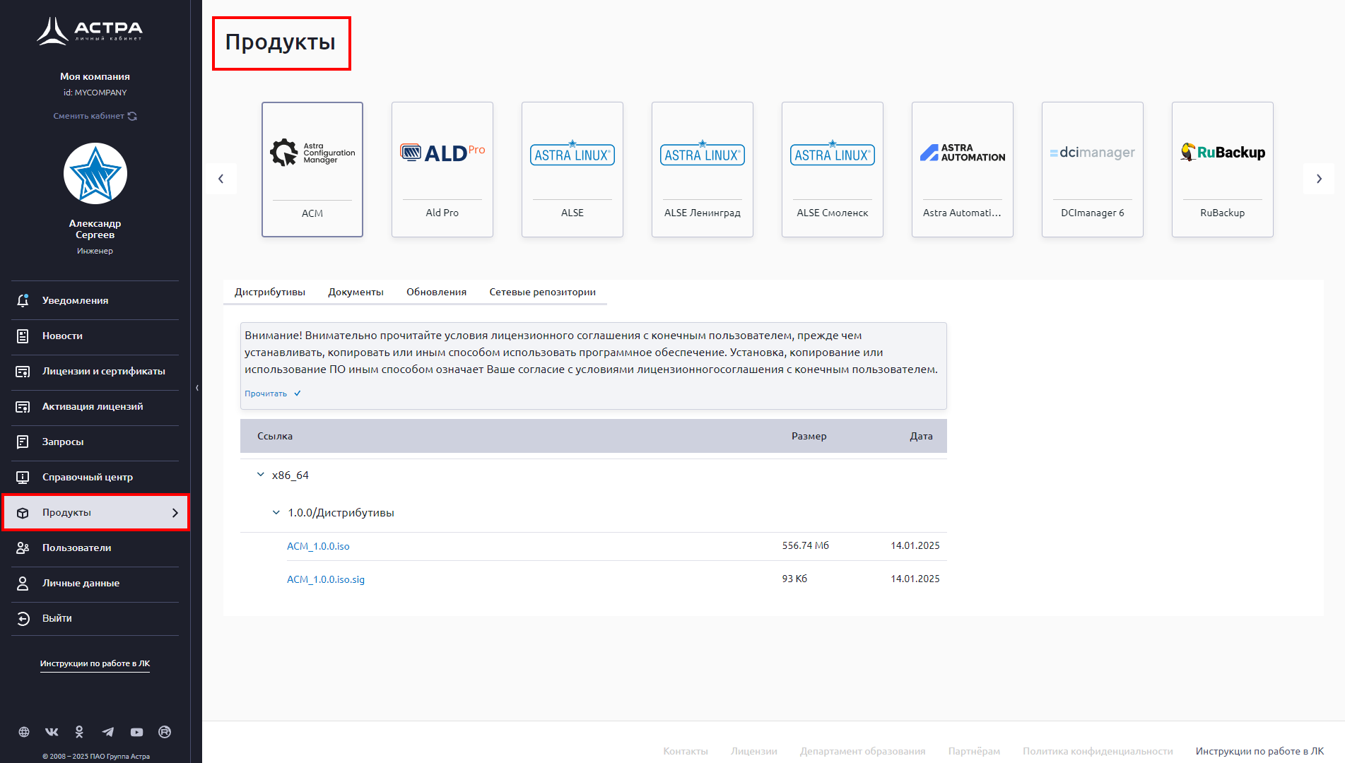 - Дистрибутивы — размещен основной установочный образ продукта.