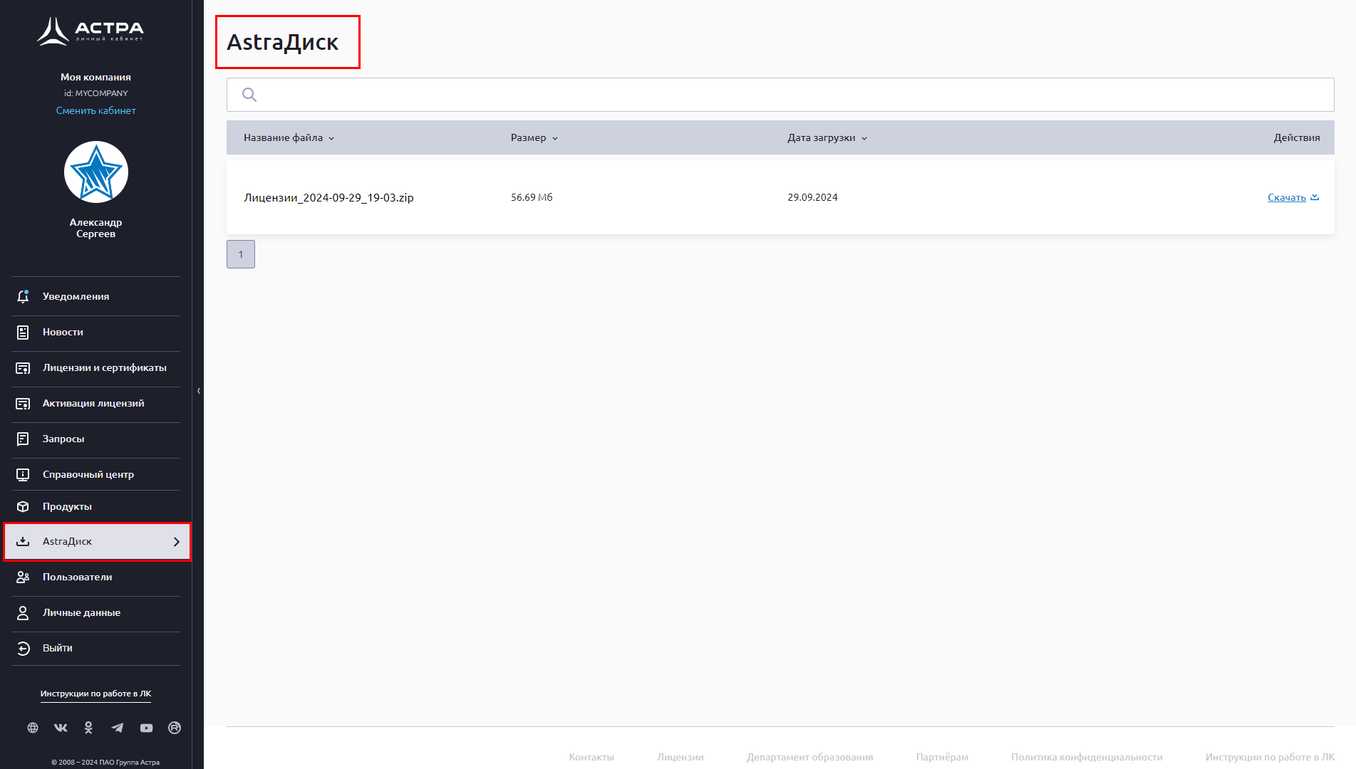 В разделе AstraДиск появляются файлы, загруженные в хранилище файлов менеджером для конкретного кабинета: