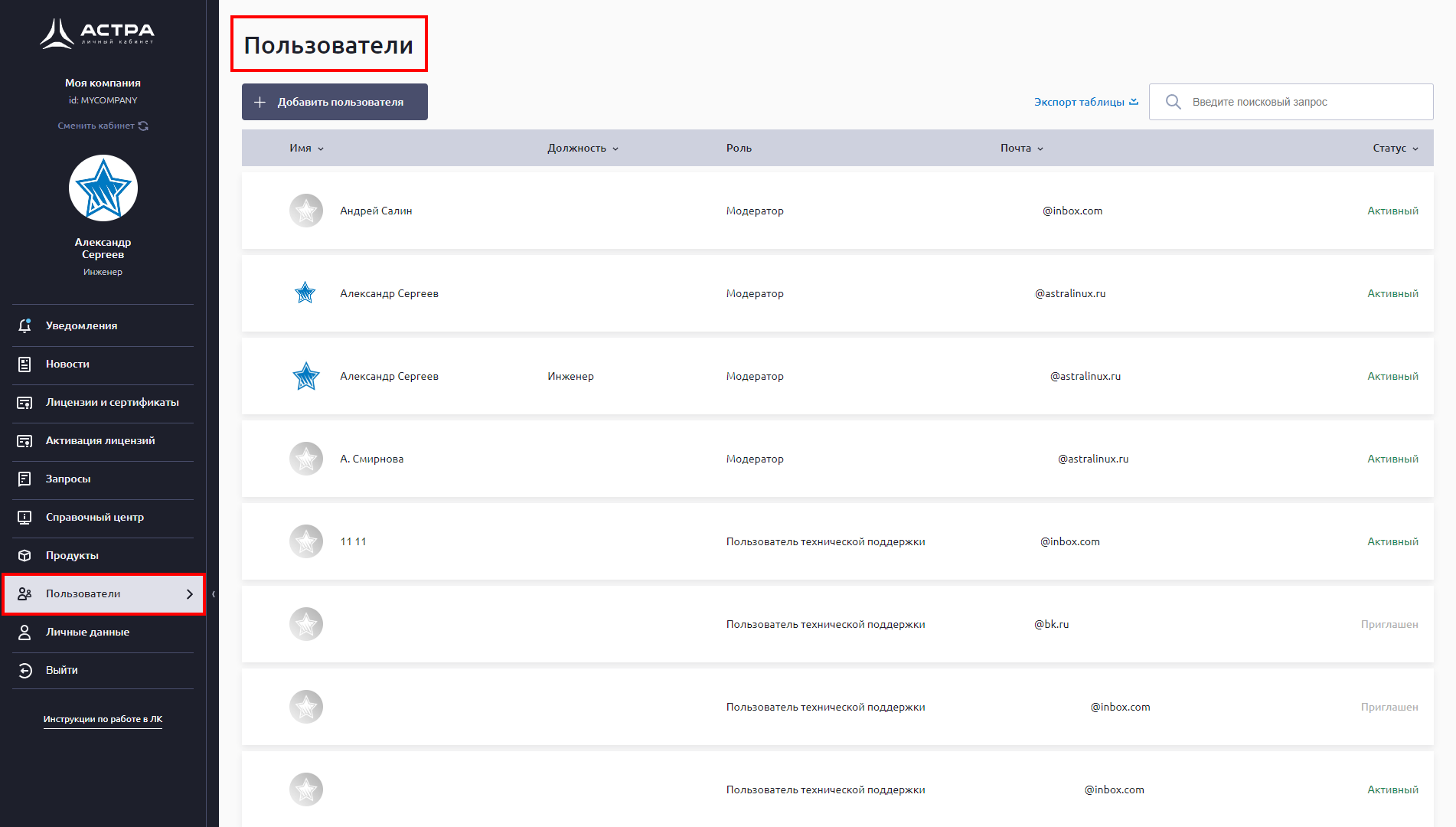В разделе Пользователи открывается список аккаунтов, для которых создан ЛК, их роли и статус активности:
