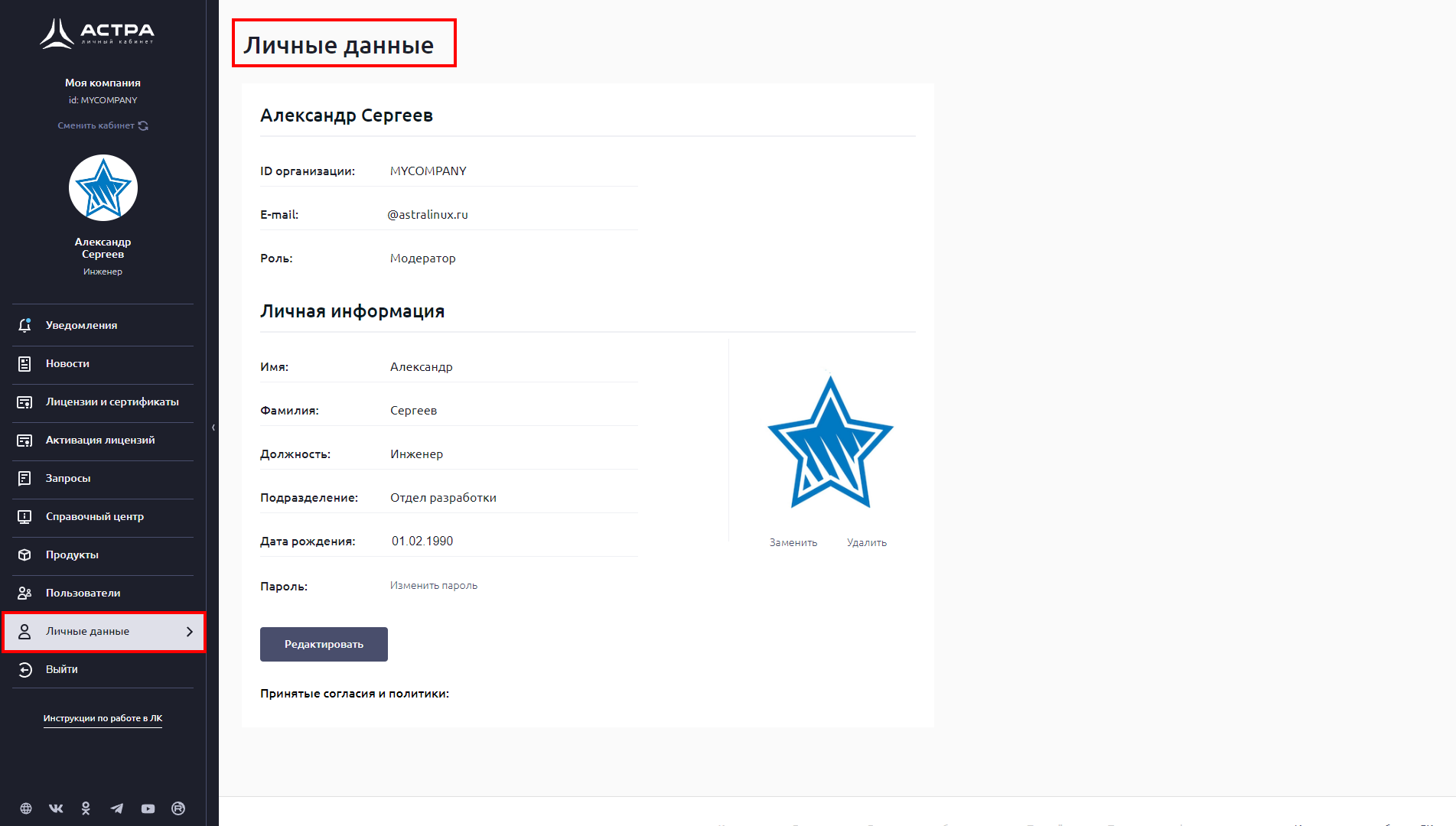 Техническая поддержка Группа Астра оставляет за собой право заблокировать или удалить аккаунты, в которых при заполнении полей Имя и Фамилия использовалась ненормативная лексика или иные некорректные данные.
