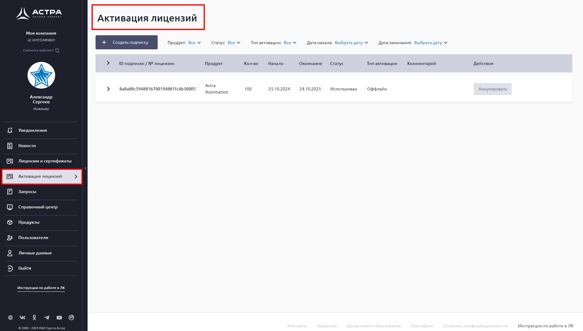 Для создания подписки выбрать интересующую Лицензию и в конце строки с информацией по ней нажать кнопку Активировать.