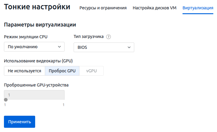Чтобы настроить проброс GPU на ВМ, при создании конфигурации в разделе Параметры виртуализации: