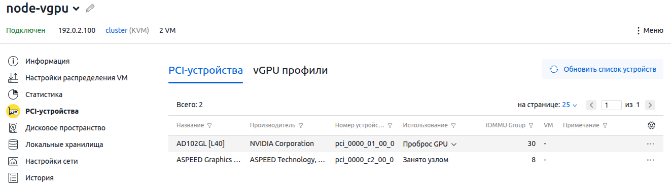 Чтобы управлять GPU-устройствами на узле кластера, перейдите в Узлы → выберите узел → кнопка Параметры → вкладка PCI-устройства. На вкладке отображается информация об устройствах:
